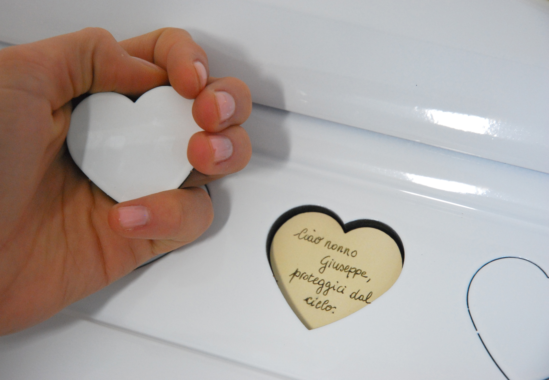 Il s’agit de la véritable empreinte innovante de la célèbre Heart Box, gravée de petits cœurs amovibles qui peuvent être conservés en mémoire de l’être aimé et remplacés par des messages d’amour dédiés.